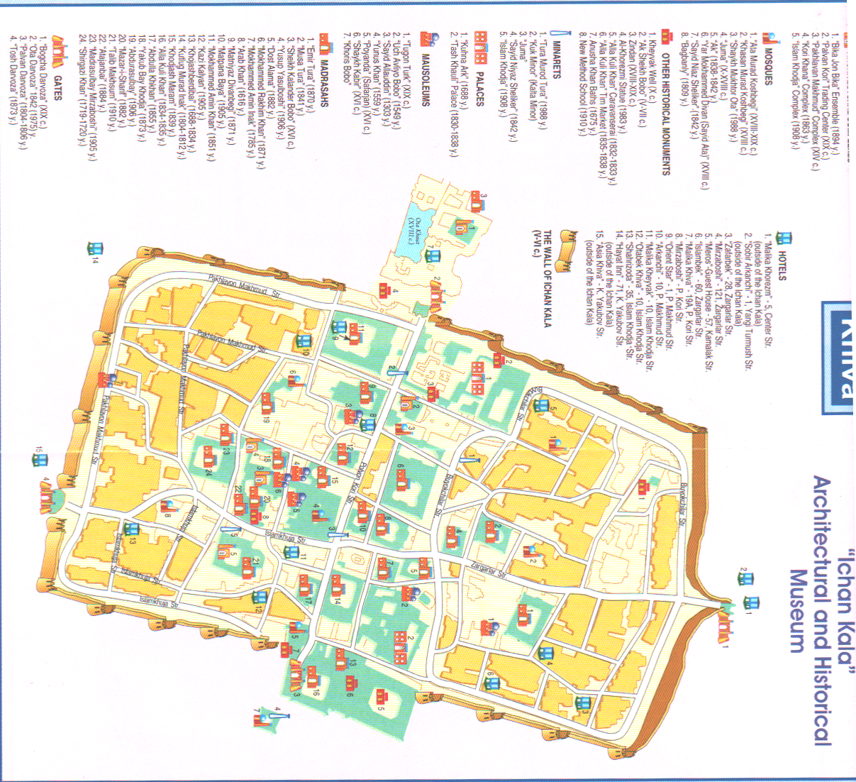 L’Ichan-Kala racchiude edifici che risalgono al 12 ° secolo, ma la maggior parte dei suoi palazzi, moschee, madrasa (scuole teologiche musulmane). Mausolei e altre strutture risalgono al periodo 1780-1850. Allora la città prosperò come deposito commerciale e fortezza lungo le rotte delle carovane che conducevano attraverso il Karakum. La città contiene alcuni degli esempi meglio conservati di architettura islamica in Asia centrale.